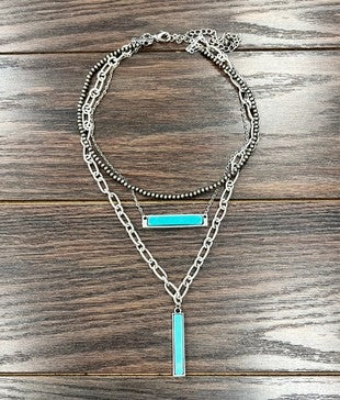 Bar Turquoise Necklace 20" Long, 3-strand Necklace, Bar Turquoise Pendants * Natural stone may vary in size, color or shape * 3 strand (15", 16", 20" long) necklace & 5" extender * 15" long, 4mm navajo pearl necklace * 16" long, small chain necklace * 20" long, large chain necklace * 1.75"W x 0.3"H top & 1.75" long bottom pendant * 65 grams weight * Turquoise on alloy metal, antique silver plate * Nickel, Lead & Chrome free |