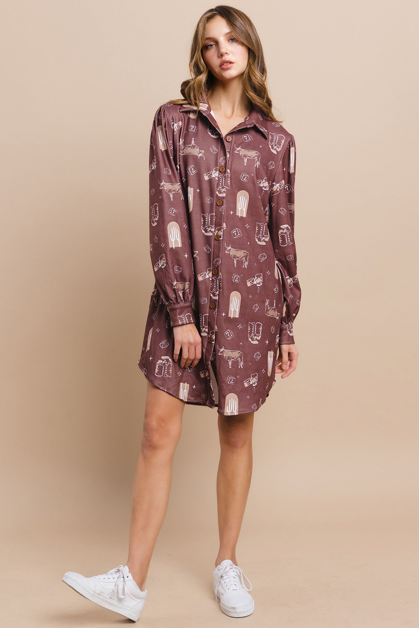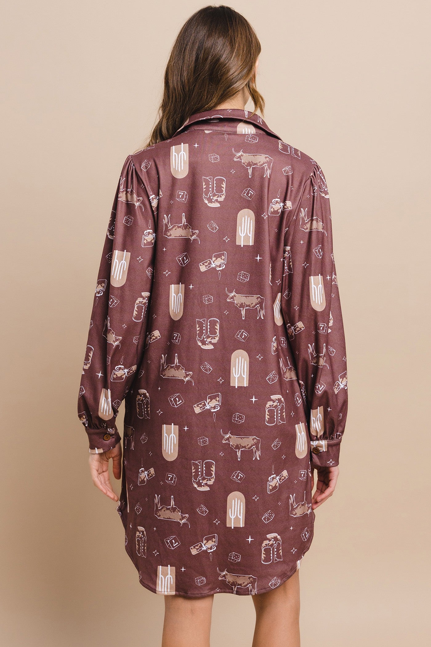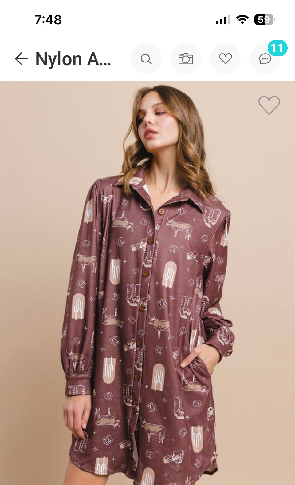 Brown button down dress featuring white and tan western details. Could be worn as a dress, shirt, or duster. 95% poly 5% spandex