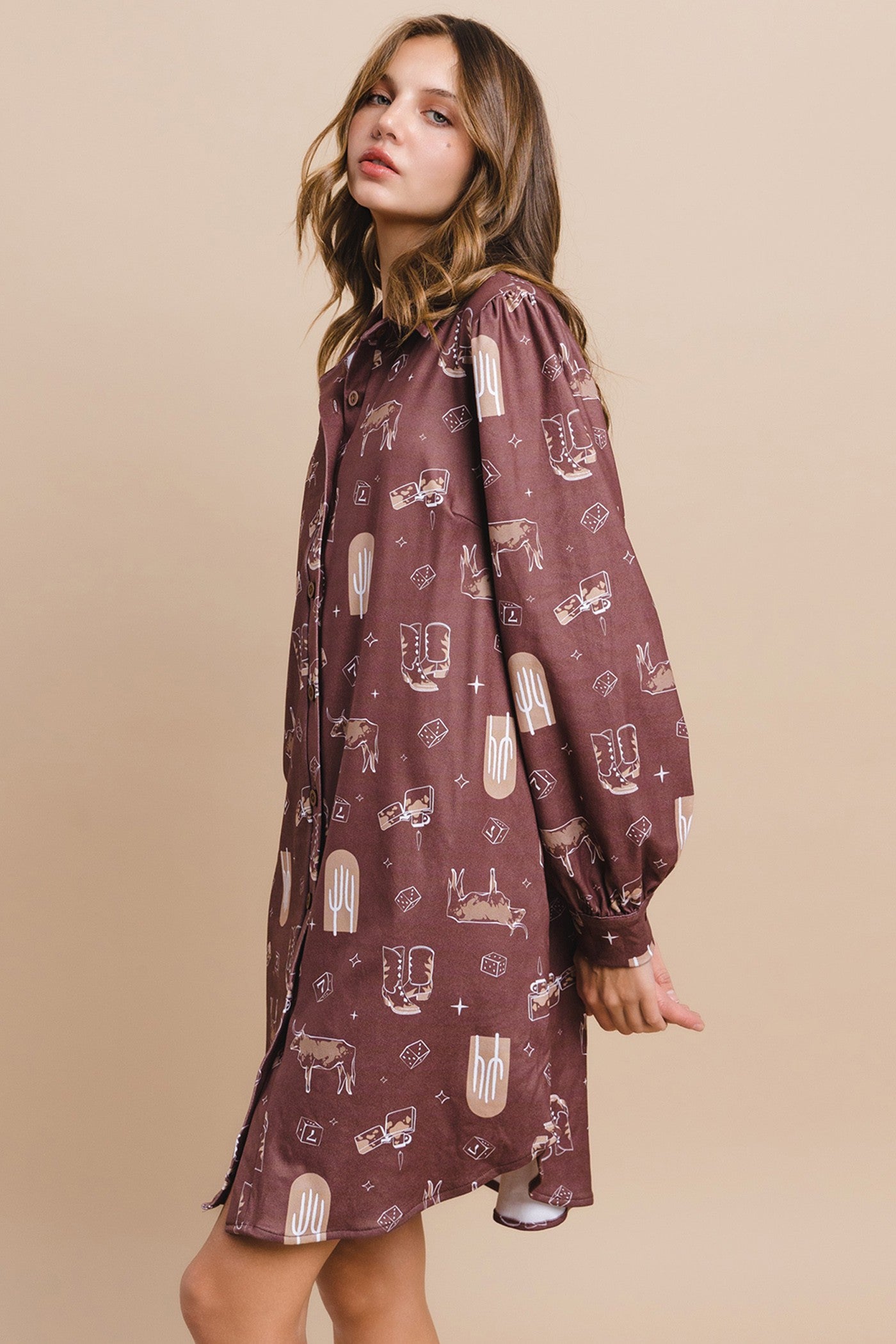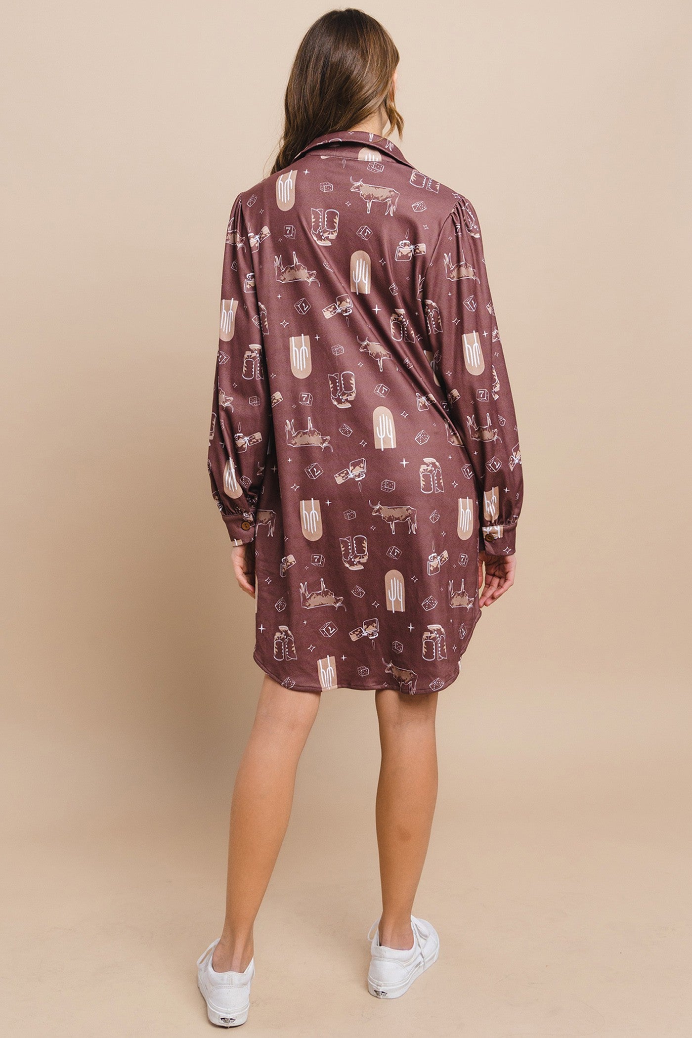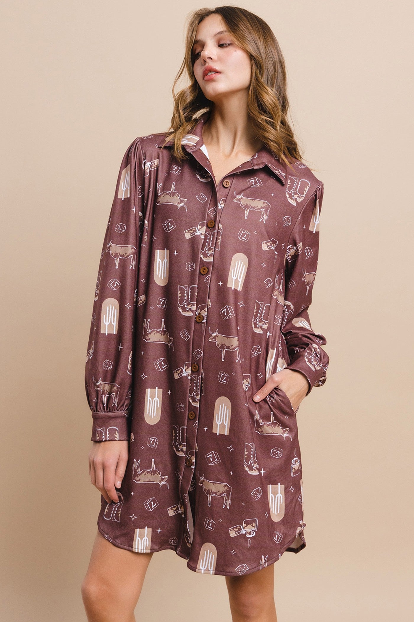 Brown button down dress featuring white and tan western details. Could be worn as a dress, shirt, or duster. 95% poly 5% spandex