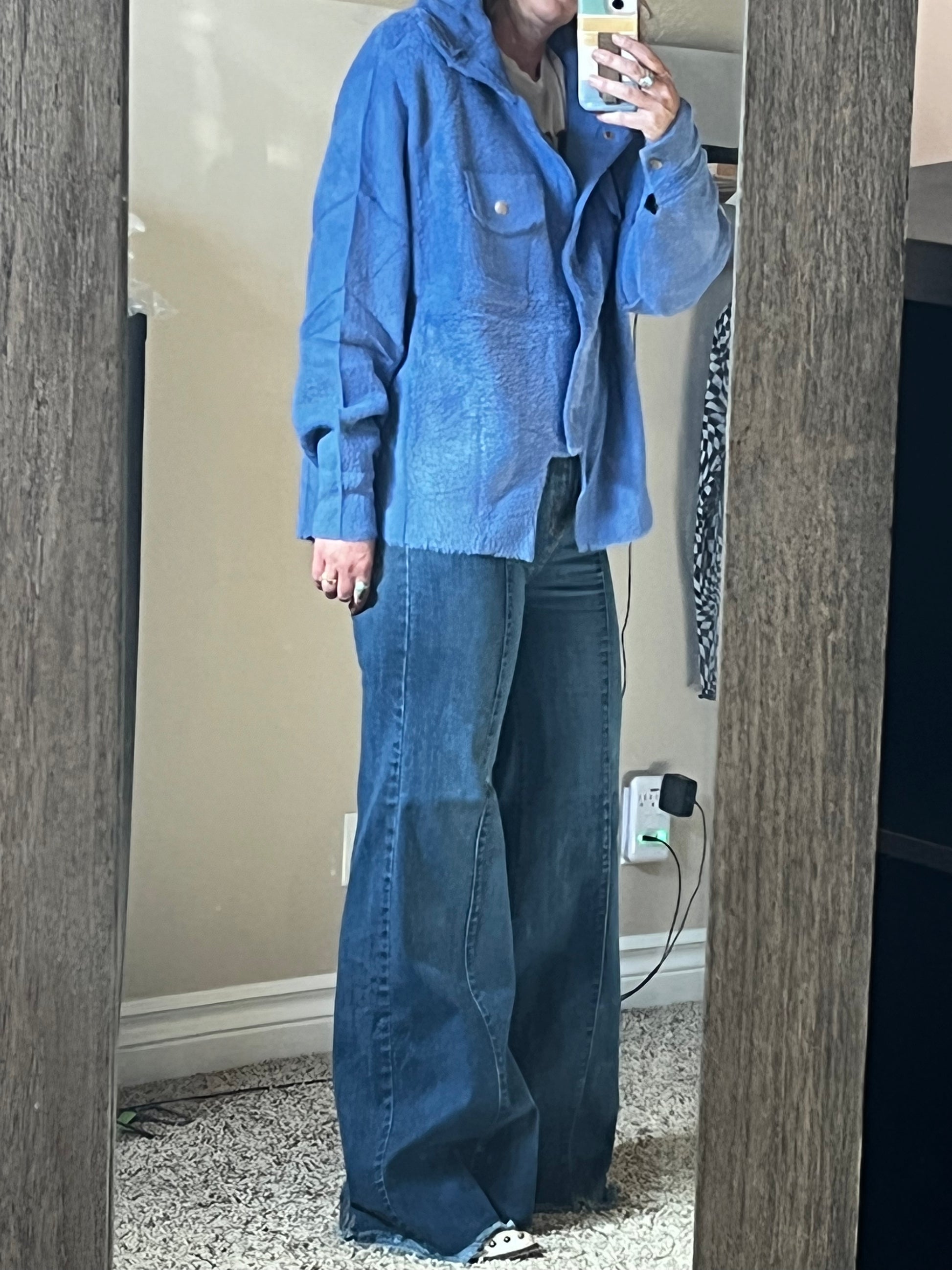 This fun jacket comes in a Turkish Blue color! Super soft and very versatile. Can be worn as a jacket or as part of an outfit.Collared neck, Snap button closure