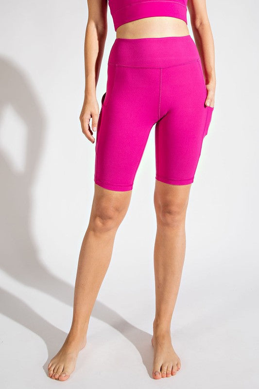 Raspberry biker shorts that hit just above the knee, super soft and comfortable