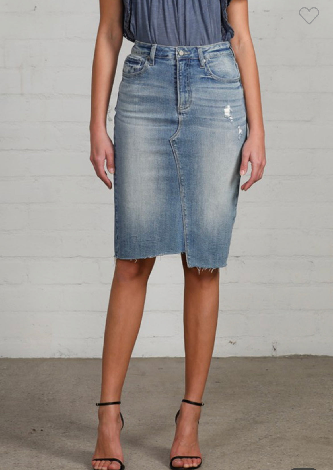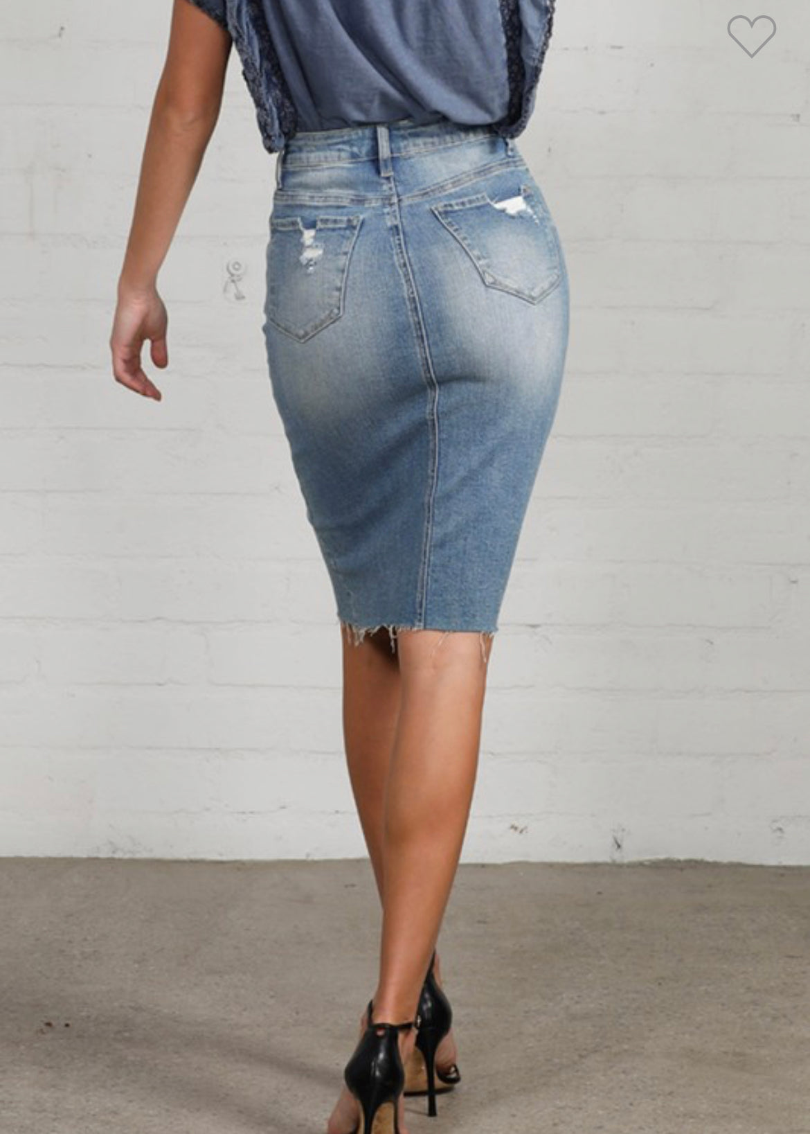 High Rise raw hem pencil skirt 98% cotton 2% spandex stretch denim-raw hem-pockets-knee length
