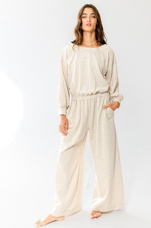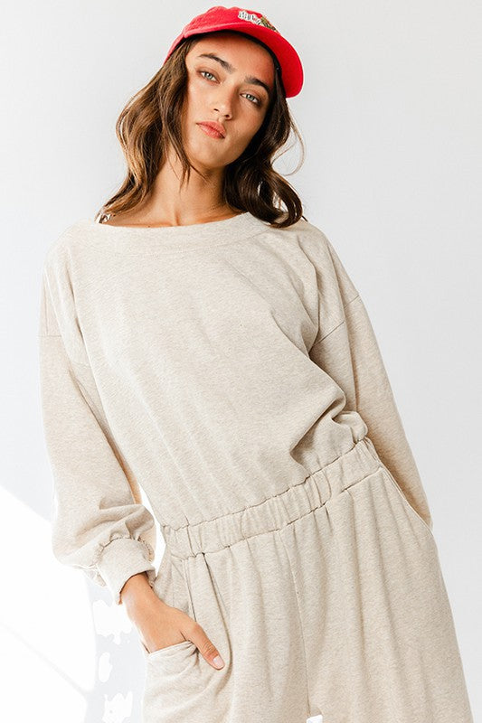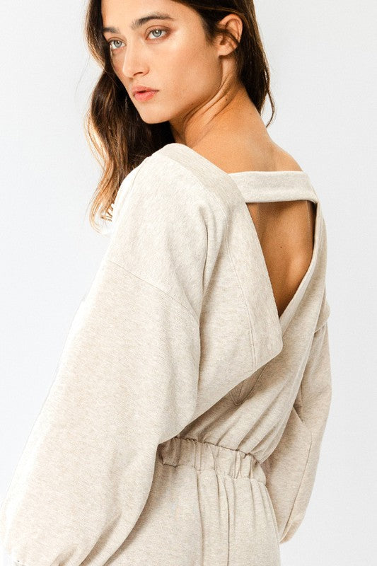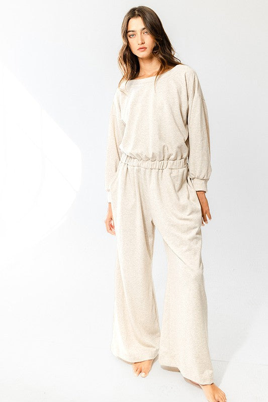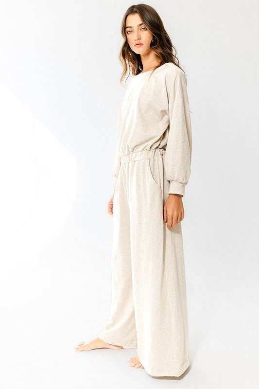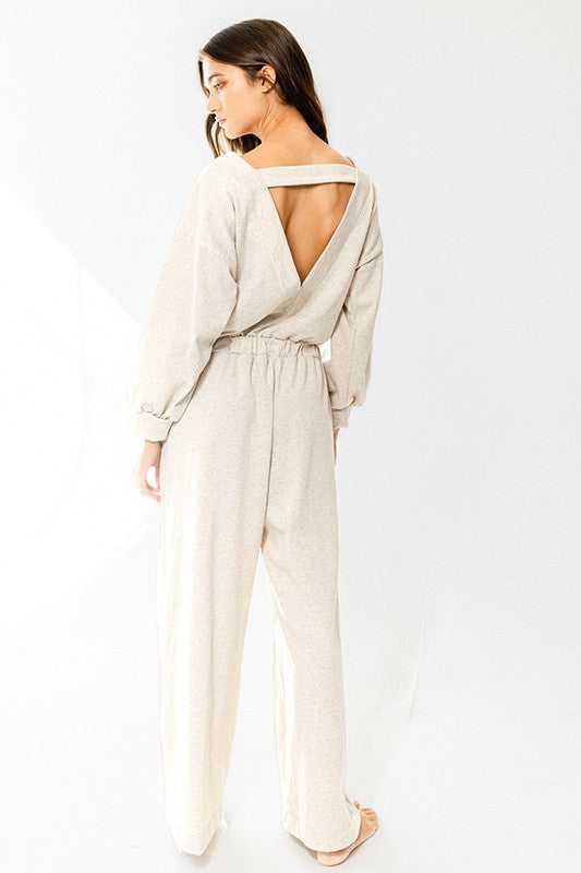Oat colored waist banded knit jumpsuit with boat neckline and cutout back detail.
