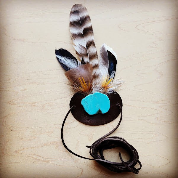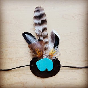 Removable hat band featuring leather, turquoise and feathers. This band is sure to elevate any of your favorite hats!